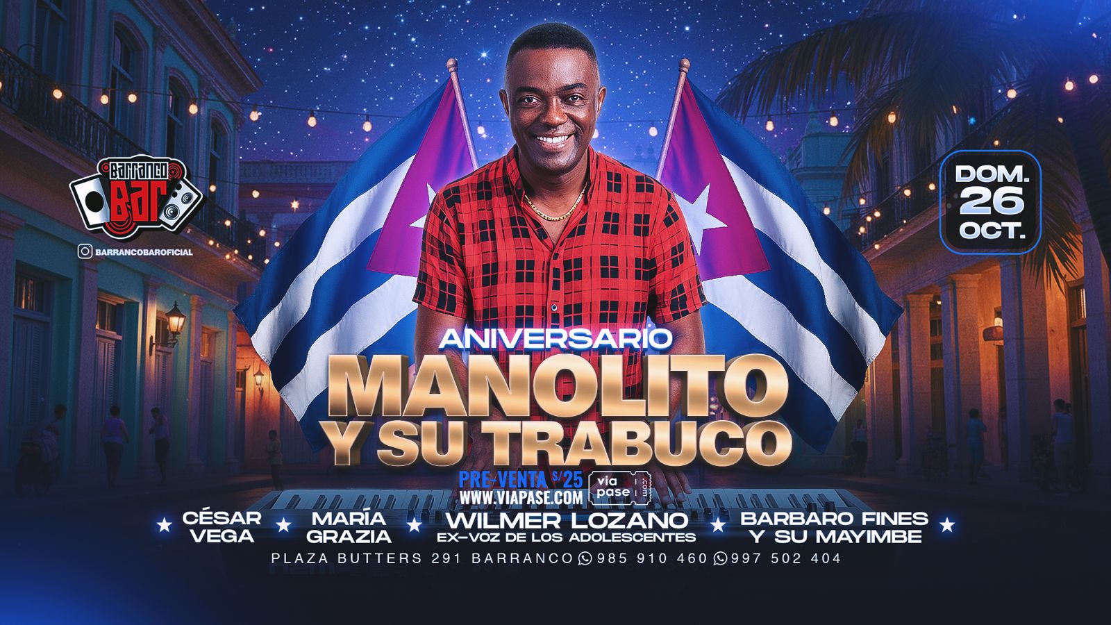 HomeNovedades Aniversario Manolito y su Trabuco - Domingo 26 Octubre 2025 - Barranco Bar Aniversario Manolito y su Trabuco – Domingo 26 Octubre 2025 – Barranco Bar PREV Salsa Deluxe – Miércoles 22 Octubre 2025 – Barranco Bar 20 de octubre de 2025 NEXT Salsa con Sabor – Miércoles 29 Octubre 2025 – Barranco Bar 26 de octubre de 2025