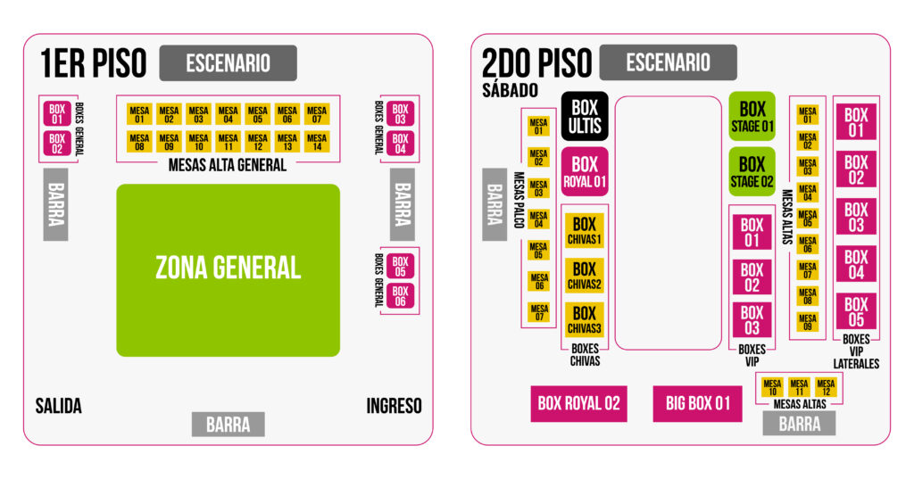 Entrada General, Box General, Mesa Alta, Mesa Palco, Vip Lateral, Box Vip, Box Chivas, Box Royal, Box Stage, Box Ultis, Big Box